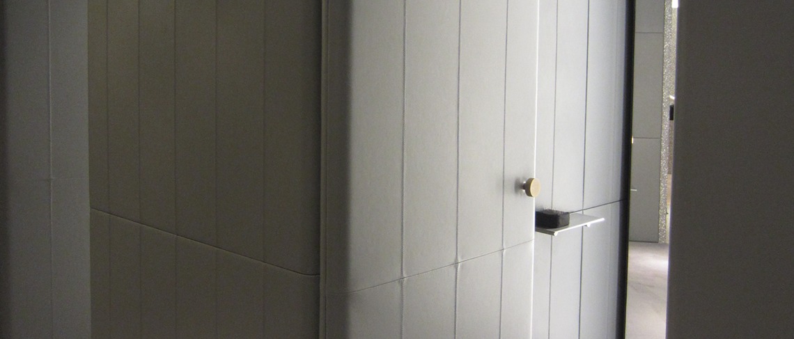 DESCRIZIONE: Rivestimento con lieve imbottitura di pannelli in MDF ignifighi, per creazione di pareti e porte camerini in pelle pieno fiore. Lavorazione a quadrotti, con cuciture a punto doppio.